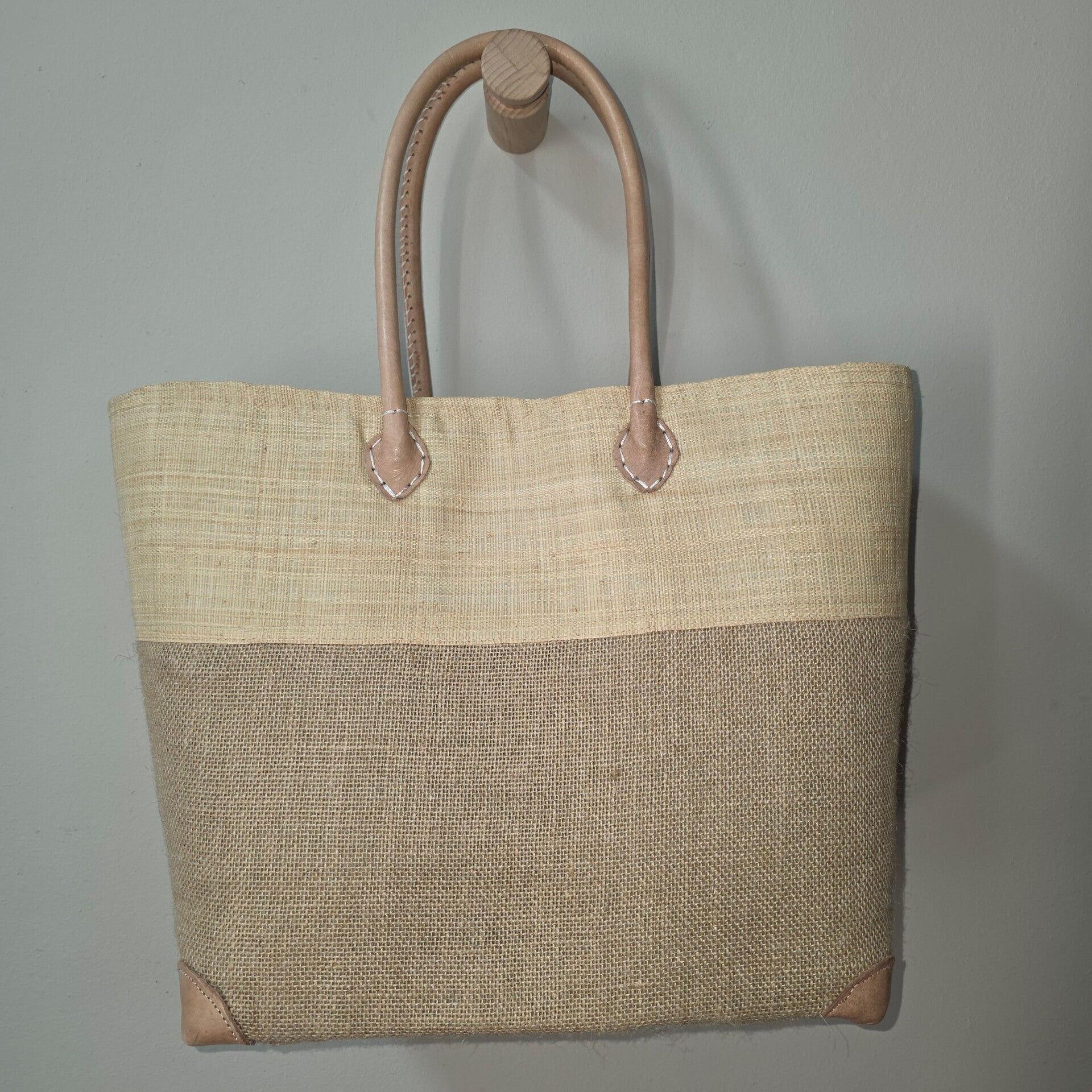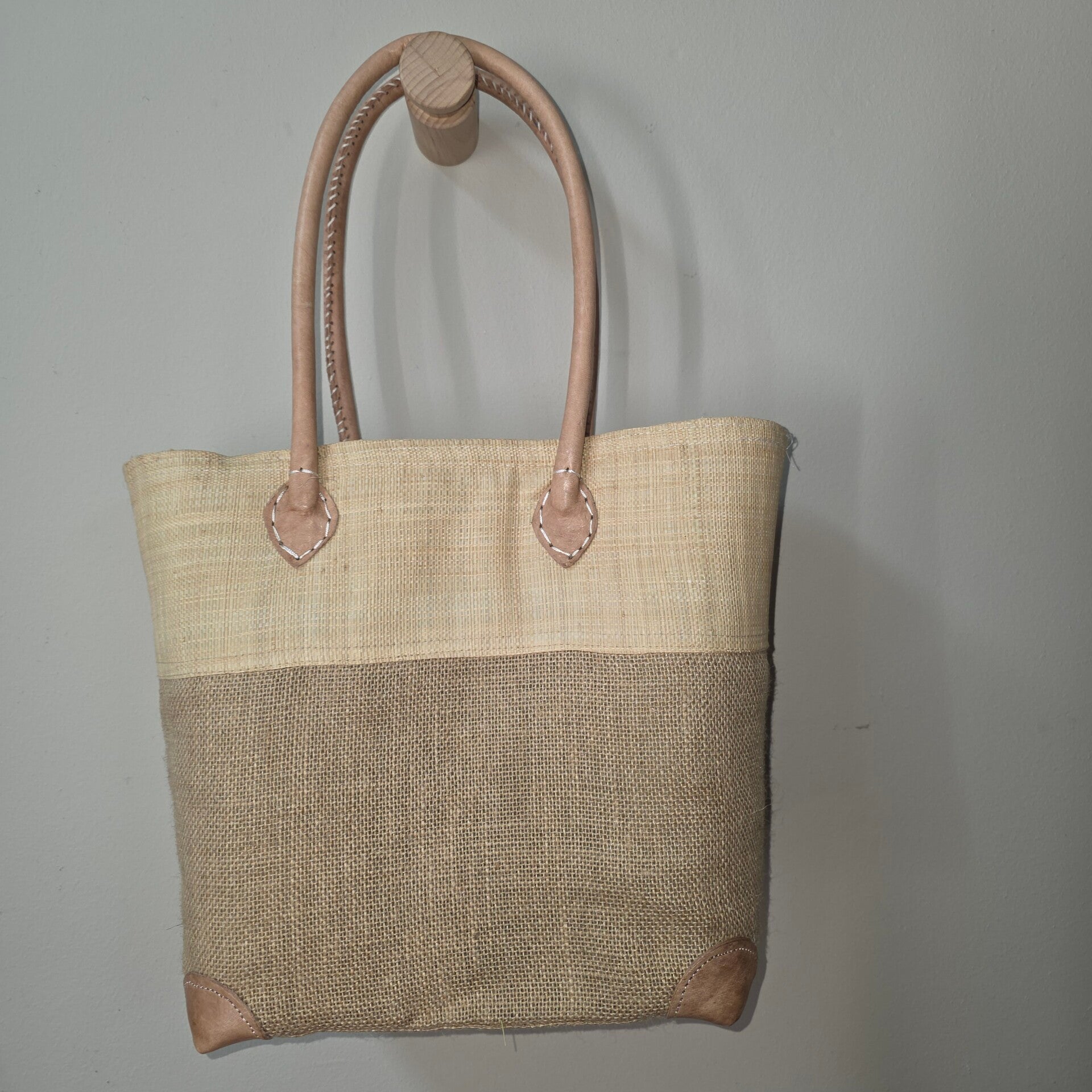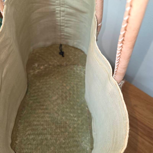 Riet/raffia met jute. Afsluitbare binnenkant, versterkte hoeken en comfortabele hengsels.