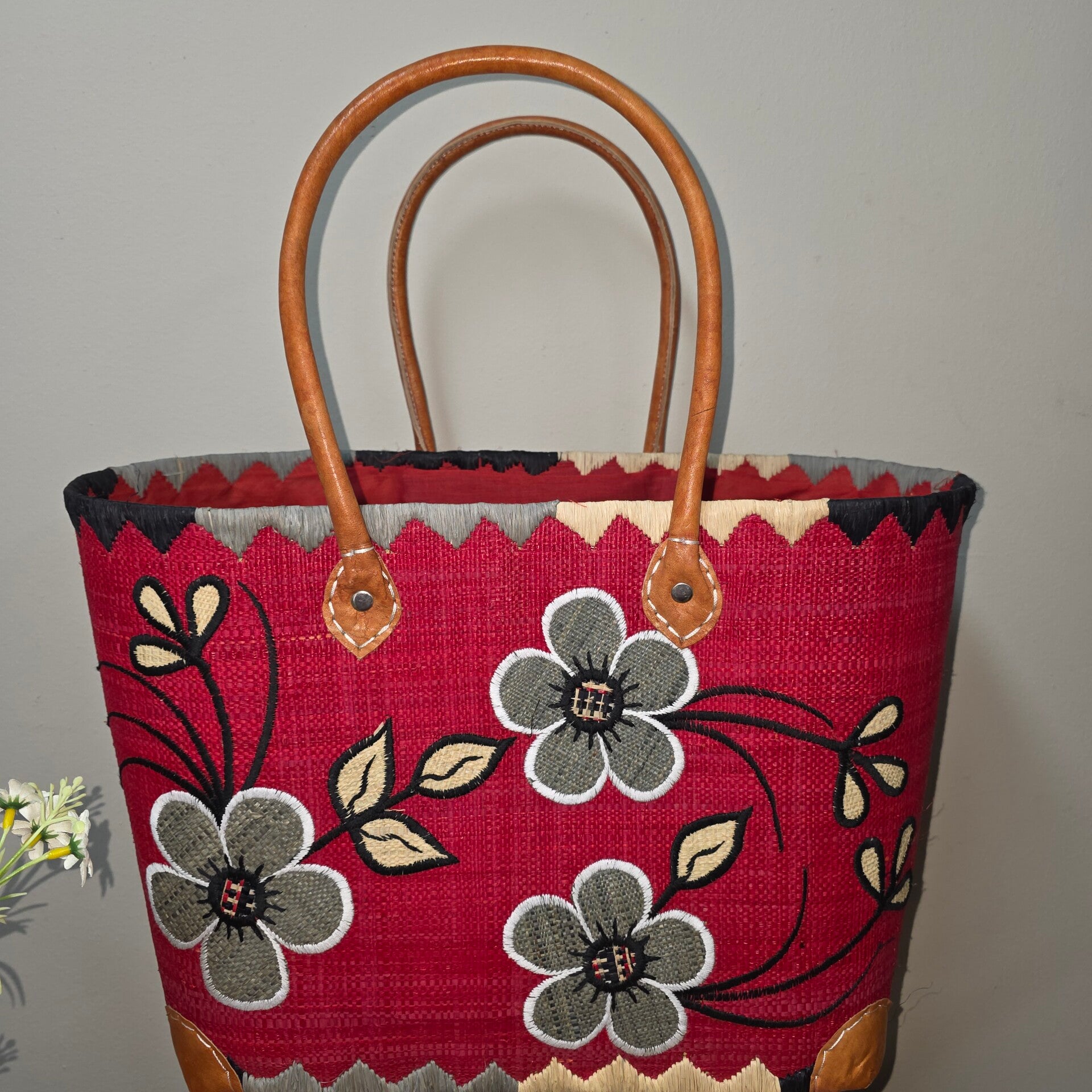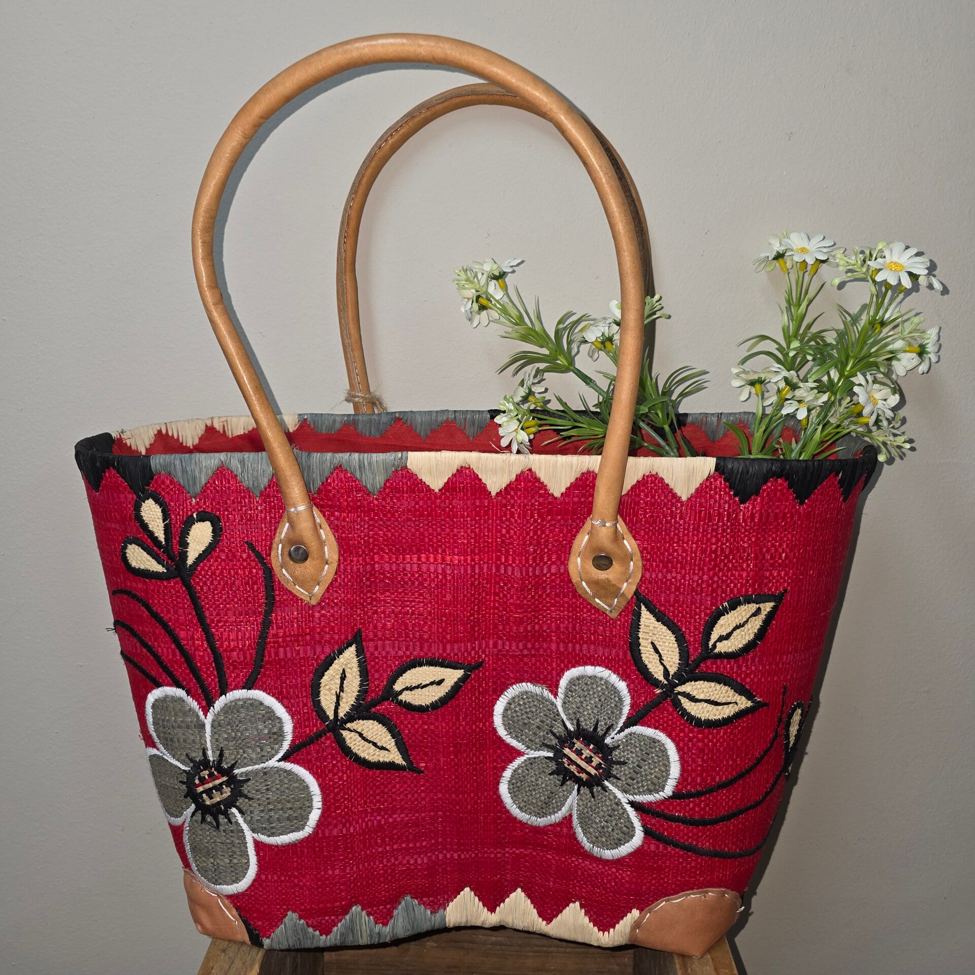 Fris rood met stijlvolle bloemen.