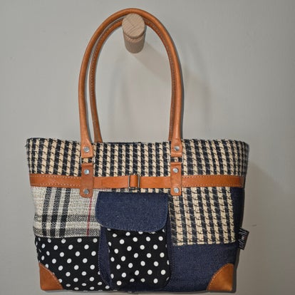 Leuke tas gemaakt met verschillende stoffen, riet.